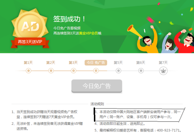 爱奇艺客户端签到送会员活动只能参与一次,详情可参考官网帮助文档。